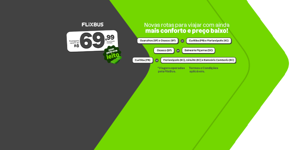 Imagine explorar as paisagens deslumbrantes, as cidades agitadas e as joias escondidas do Brasil com a facilidade e a economia da FlixBus! Seja para começar uma aventura pelo país, explorar novos cantos do Brasil ou até planejar uma viagem internacional, a FlixBus está aqui para fazer isso acontecer. Com mais de 250 destinos e 1.200 rotas diretas de ônibus em todo o Brasil, expandimos nossa rede cada vez mais para aproximar as pessoas dos lugares mais interessantes. Desde 2013, conectamos milhões de viajantes aos seus destinos favoritos, agora em mais de 40 países. E, com passagens de ônibus a partir de apenas R$ 19,99, sua próxima viagem está mais perto do que nunca.